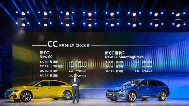 新CC提供330 TSI炫目版、330 TSI上市特別版、380 TSI奪目版、380 TSI耀目版四款車型,售價(jià)區(qū)間為24.99-29.29萬(wàn)元;新CC獵裝車提供330 TSI獵目版、380 TSI獵心版、380 TSI獵風(fēng)版三款車型,售價(jià)區(qū)間為25.69-29.99萬(wàn)元。