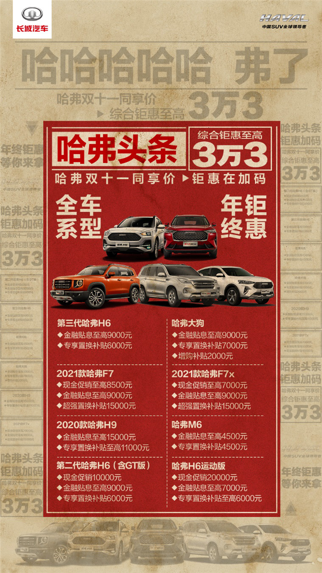 哈弗品牌就是車圈善于“打時間差”的促銷高手,不但讓雙11的“抄底”氣氛一分未減,反而讓人恍然大悟,原來其年度促銷好戲才剛剛開始。11月25日,哈弗接棒長城汽車雙十一超級直播夜活動,舉辦了一場“雙十一同享價 哈弗鉅惠再加碼”年終促銷活動線上溝通會,促銷主題實在是太“魔性”了——竟然叫“哈哈哈哈哈,弗了”。