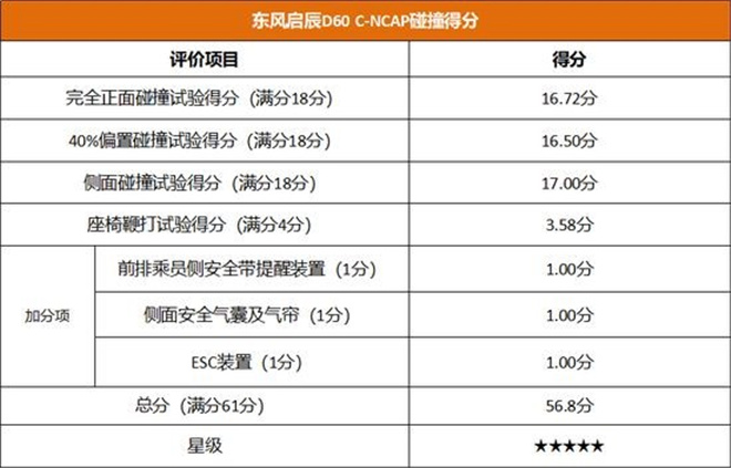 啟辰D60不僅連續(xù)兩年獲得汽車之家中國車系質(zhì)量排行榜第一名,更憑借超強節(jié)油能力,獲得2020年CCRT中國工況油耗評價結(jié)果(轎車)排行榜第一名的榮譽。安全方面,啟辰D60在中國汽車技術(shù)研究中心2018年第二批的C-NCAP碰撞中,以56.8的高分榮獲五星安全認定(滿分61分),名列top1。