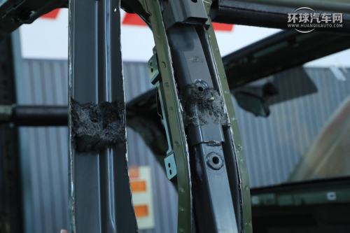 BJ40另一個特別安全配置則是“雙B柱”,拆解過程中我們發現BJ40的雙B柱居然是實心的,除了封閉管材之外,剛才介紹過的防滾架也有一部分插入了進去,形成了“雙重保護”。這樣的雙重保護不僅僅是對于側撞的高強度防護,同時更是車頂抗壓能力的直接支撐!這樣的車頂抗壓力加上剛才所說的防滾架,讓BJ40整個多閉環的車身結構,可以做到“上不松,下不動”。
