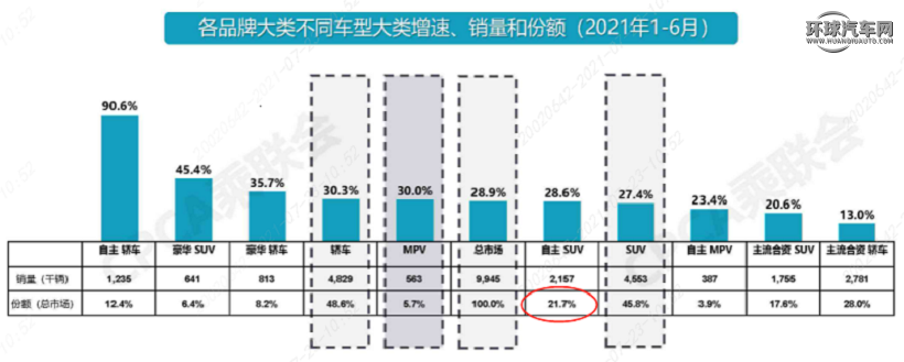 乘聯會數據顯示,今年上半年,自主SUV累計銷售215.7萬輛,占據國內21.7%的市場份額,僅次于主流合資轎車,成為國內第二大細分市場。