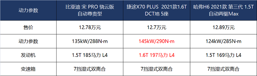 捷途X70 PLUS和第三代哈弗H6都提供兩款發動機給用戶選擇,而第二代宋Pro雖然全系都搭載1.5T發動機,但是不同版型采用不同的功率調校。