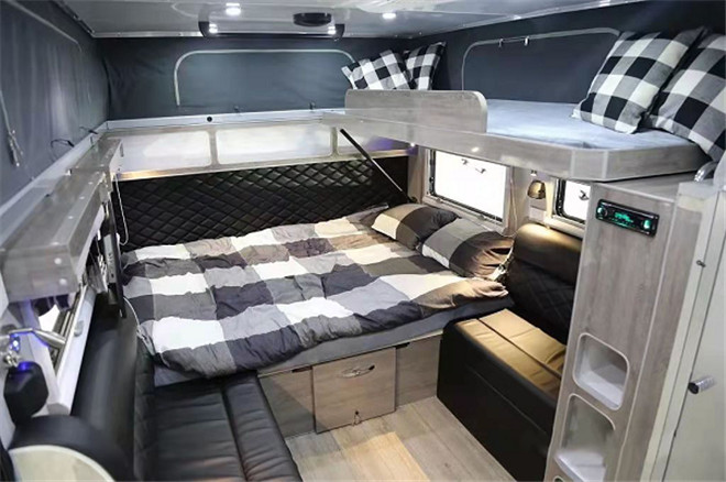 車隊在服務區的時候,吃完飯,每個人都能在車上休息會,這是因為黑系房車將高級別旅行拖車所有相同功能打包到12英尺的硬頂式拖車中。帶網狀窗戶的專用帆布和鋁板組合的升頂結構的組合,將內飾空間提升0.5m,空間感十足。