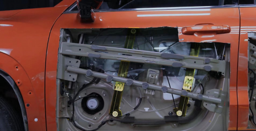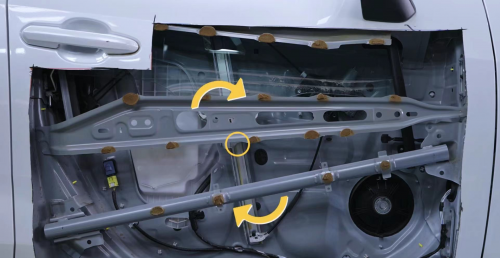 值得一提的是,針對豐田RAV4榮放用戶所反映的車窗玻璃晃動情況在本次拆解中也得到了解答,榮放的車窗玻璃采用的是單導軌的升降機,由于只有一個固定點所以車窗難免會有一定幅度的晃動。而哈弗大狗則采用了更為穩妥的雙導軌車窗升降機布局。
