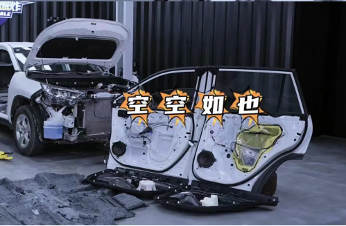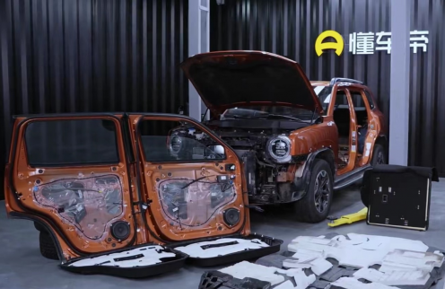 而在進一步的拆解之后,兩款車在用料上的差距則更直觀的體現了出來。比如在車內隔音棉的選材上,哈弗大狗的車門、車頂、車底等部位都選用了更為環??煽康陌咨w維棉材質,而榮放不僅車門內沒有隔音棉,整車其他部位所采用的隔音棉也都是都是二次利用的低成本的回收棉,眾所周知回收棉不僅隔音效果不及纖維棉,在有害氣體的揮發方面也高出不少,對車內成員極為不友好。