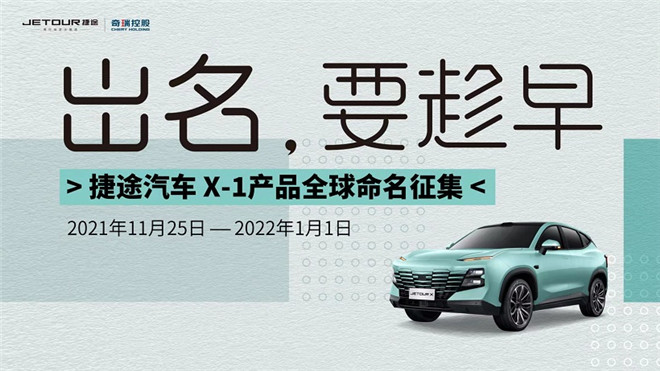 秉承用戶共創(chuàng)理念,近日捷途汽車宣布內(nèi)部代號為X-1的全新A級SUV將于2021年11月25日正式開啟“出名,要趁早”全球征名活動,最終榜單將于2022年1月1日正式公布,20強作品還有好禮相贈!