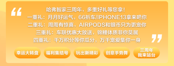 讓顧先生沒想到的是,這幾天哈弗智家APP舉辦三周年慶典活動,注冊成為用戶就有機會贏取66折購車權、iPhone13、AirPods耳機、紀念銀幣等好禮。“想不到一抽就中了一副耳機,看來之前參加車友群的活動沒白費哈哈哈哈。”不僅產品力強勁,還這么關愛車主,與用戶玩在一起,這樣的哈弗初戀你還不趁優惠入手一臺?