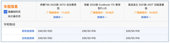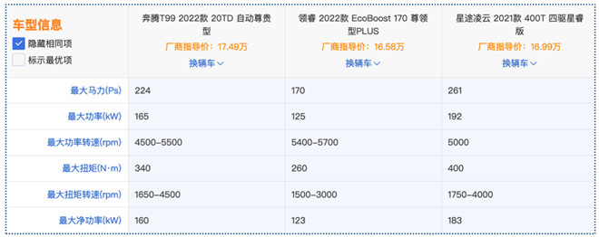 如果以16萬左右的價格作為預算買SUV,放在從前,市面主流產量都集中在緊湊型的級別,但近幾年隨著競爭越來越激烈,不少打破級別局限的中型SUV將價格下探,以更龐大的體型更高的品質,形成“降維打擊”,無疑,對于追求“大車”的消費者來說相當友好。今天我們就對比三款中型SUV奔騰T99 20TD 自動尊享型、福特領睿EcoBoost 170尊領型PLUS、星途凌云400T四驅星瑞版,看看在16萬左右(經銷商參考價)的價格,怎么買質價比最高。