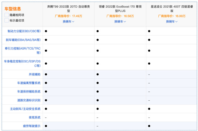 首先看主被動安全配置,三款車差異如下圖。奔騰T99和福特領睿搭載的配置很豐富,但奔騰T99多出了疲勞駕駛提醒,這一功能可實時監測駕駛者的面部表情,如有打哈欠、閉眼睛等行為時,系統便會采取語音警示等措施提醒駕駛者注意休息,降低事故發生率,提升行車時的安全。而相比于前兩者,星途凌云缺失了不少功能。