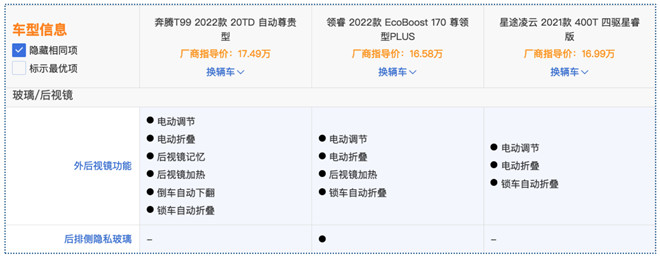 其次,在細節配置上,奔騰T99的外后視鏡支持電動調節、折疊、記憶等,還可以加熱,雨天或是冬季,可讓行車視線免受干擾;福特領睿是三款車中唯一具備后排隱私玻璃的車型。
