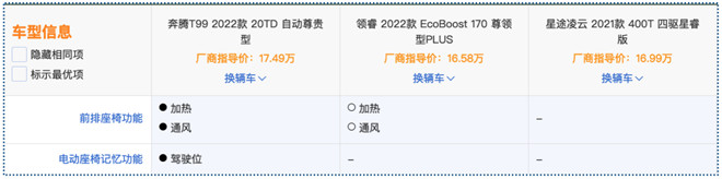 三款車的內飾風格有所區別,綜合來看,福特領睿更簡約,星途凌云更運動,而奔騰T99的科技感比較強,在聯屏設計的基礎上還加入了空調控制屏,雖然星途凌云同樣也配有空調顯示屏,但仍有實體按鈕,相比之下,前者的質感要更好。而且,奔騰T99還支持前排座椅加熱通風以及駕駛位記憶,舒適度上也很不錯。