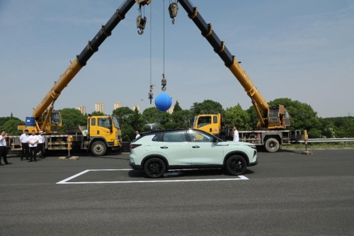 在0.15秒起步響應(yīng)測試環(huán)節(jié),為了能夠直觀地感受到皓極的加速性能,裝有水的氣球被懸吊在車輛上方,車頂?shù)匿J利刀片會在車輛啟動瞬間劃破氣球,形成自由落體的水花,皓極與瞬間下落的水花比拼速度,通過瞬時爆發(fā)的加速性能,及時避開水花,充分展現(xiàn)出皓極強(qiáng)勁的動力性能,測試工程師向竺延風(fēng)介紹,市場上同級車輛的起步加速響應(yīng)較好的水平在0.25~0.4s,特斯拉在0.1~0.15s,而皓極雙擎混動迸發(fā)出的0.15s啟動速度比肩特斯拉。竺延風(fēng)稱贊皓極 “車隨心動”。