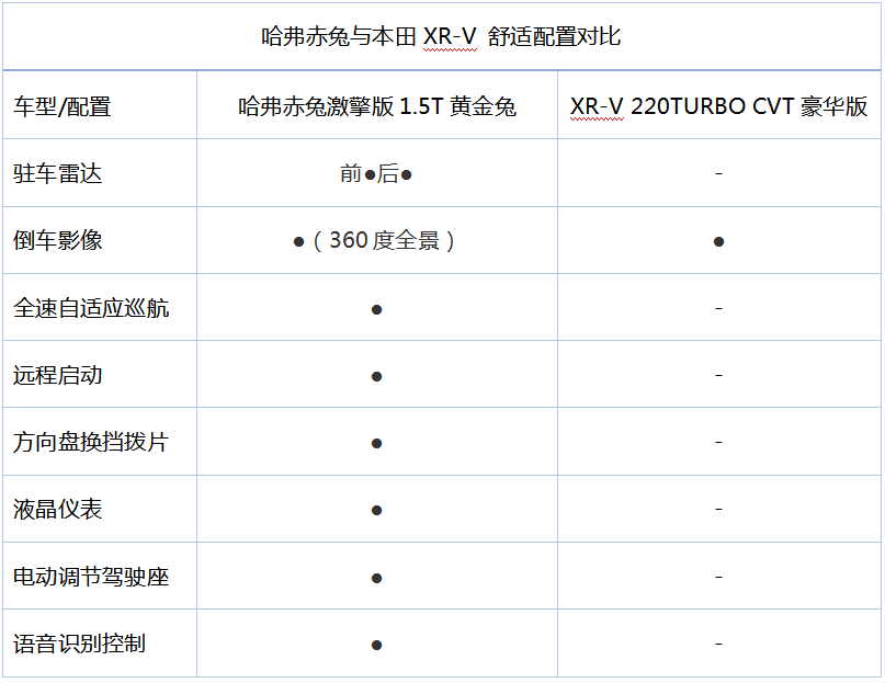 動(dòng)力對(duì)比:同為1.5T,哈弗赤兔性能卻更強(qiáng) “有哈弗赤兔相伴,假日的長(zhǎng)途自駕讓我們?nèi)叶紲剀笆孢m。流暢的車機(jī)操控體驗(yàn)以及舒適的內(nèi)部氛圍,說(shuō)起哈弗赤兔,我們家三歲的孩子都能豎起大拇指”,哈弗赤兔的車主這樣說(shuō)道。的確,除了運(yùn)動(dòng)和精致的內(nèi)飾設(shè)計(jì),哈弗赤兔的配置確實(shí)很高,即便是中配車型,常用的舒適配置也夠齊全,相比之下本田XR-V則顯得比較“保守”。在實(shí)際駕車體驗(yàn)中,哈弗赤兔的智能科技配置豐富,車道偏離預(yù)警和車道保持輔助能夠在復(fù)雜的擁堵路面為駕駛員減輕駕駛疲勞,更大程度上輔助車輛駕駛,而主動(dòng)剎車功能更像是一個(gè)時(shí)刻待命的機(jī)器人,守護(hù)著車內(nèi)外乘員的安全。