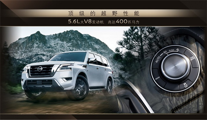 動力方面搭載了日產5.6L V8(VK56)缸內直噴發動機,最大功率294kW、400馬力,最大扭矩為560N·m,達到量產級別自然吸氣V8發動機的極致性能。V8發動機匹配非承載式車身以及飽受好評的底盤與四驅系統,北美版途樂在越野性能上一脈相承。