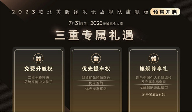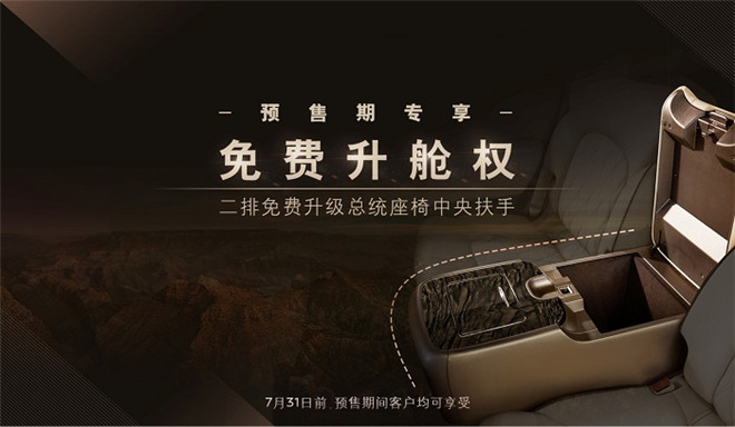 即日起至7月31日,預售期內交付2023元誠意金(隨時可退),將享受“免費升艙、優先提車、旗艦尊享”等專屬福利。