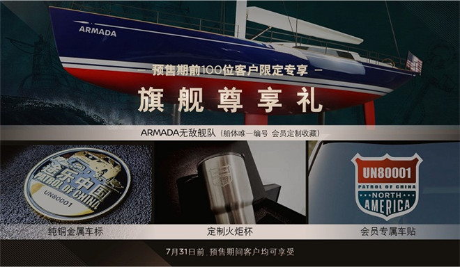 3、旗艦尊享禮——預售期間,前100位參與預訂的客戶,均可在提車時免費附贈由途樂中國提供的北美序列無敵艦隊專屬個人編號車標套裝,以及無敵戰艦ARMADA號私人收藏游艇模型;