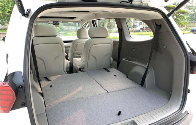 說到庫斯途的后備箱空間,也進一步印證了這款車注定為家庭用戶而生。滿載情況下,后備廂容積為262L,放3個常規拉桿行李箱不成問題;第三排座椅放倒后,容積擴展至707L,裝載能力十分強悍。