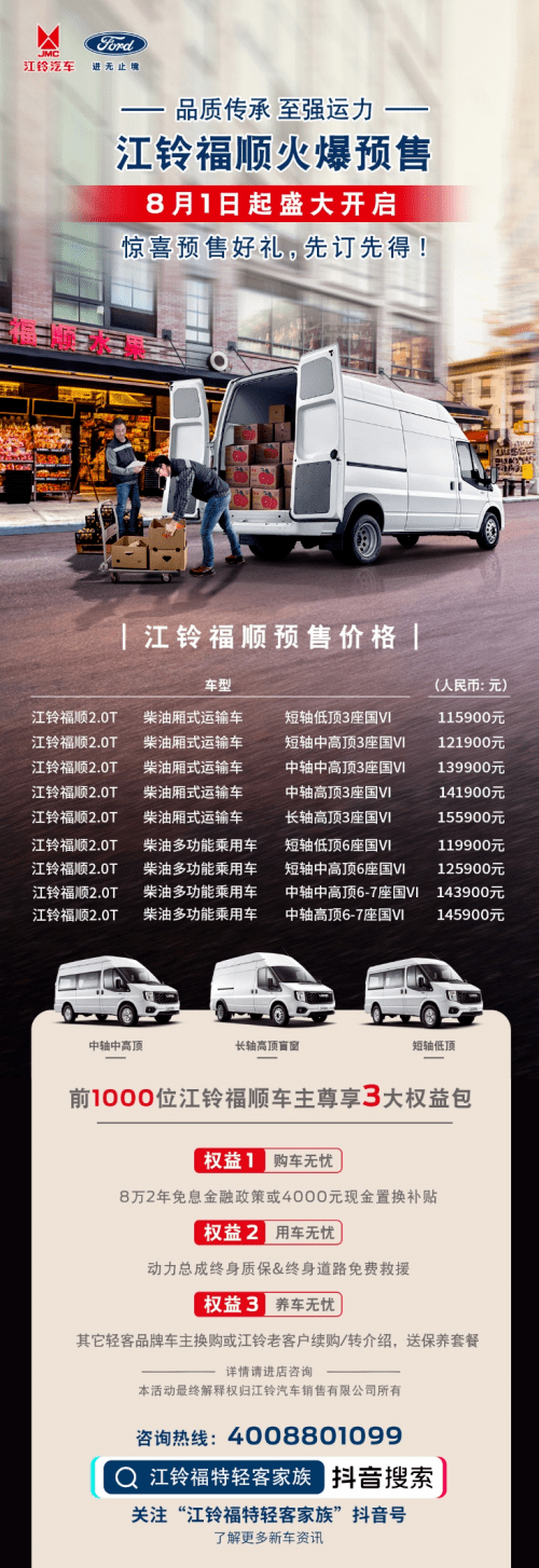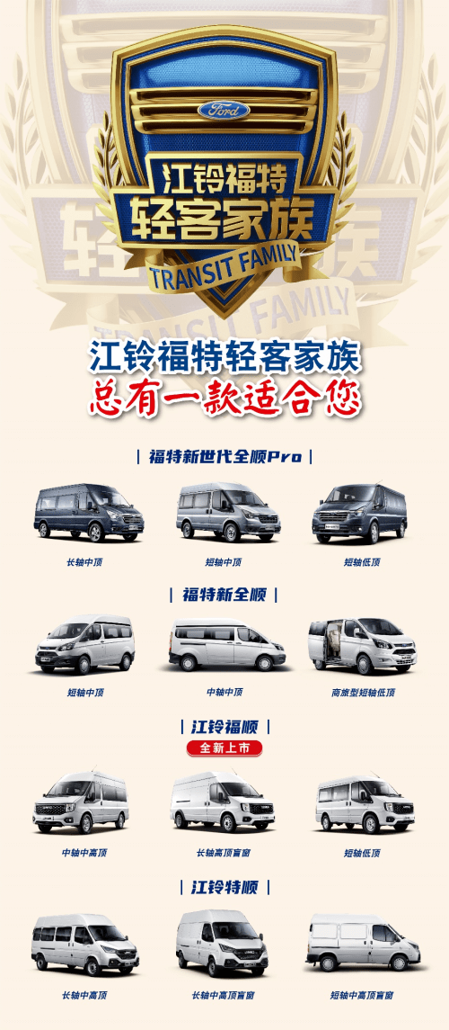 其實江鈴福特輕客家族中的四款產(chǎn)品,有它們各自的適用場景和使用人群。“歐系高端旗艦輕客” 新世代全順Pro,主要受公檢法司、醫(yī)療衛(wèi)生等行業(yè)客戶的青睞,也被大型企業(yè)用來做商務(wù)接待之用。“精致多功能輕客”福特新全順,多用作城市物流和高價值貨品配送車輛。而“高性價比合資輕客”特順的客戶群體是那些追求性價比的企業(yè)和個體戶、大型物流運輸車隊。“運力強大的品質(zhì)型輕客”福順的主要使用人群是精打細(xì)算的個體戶和私營企業(yè)主,他們重視車輛的性價比,也講究一分錢一分貨,非常看中車輛的品質(zhì),對空間也有突出需求,福順的合資品質(zhì)、自主價格、大空間非常貼合他們的需求。