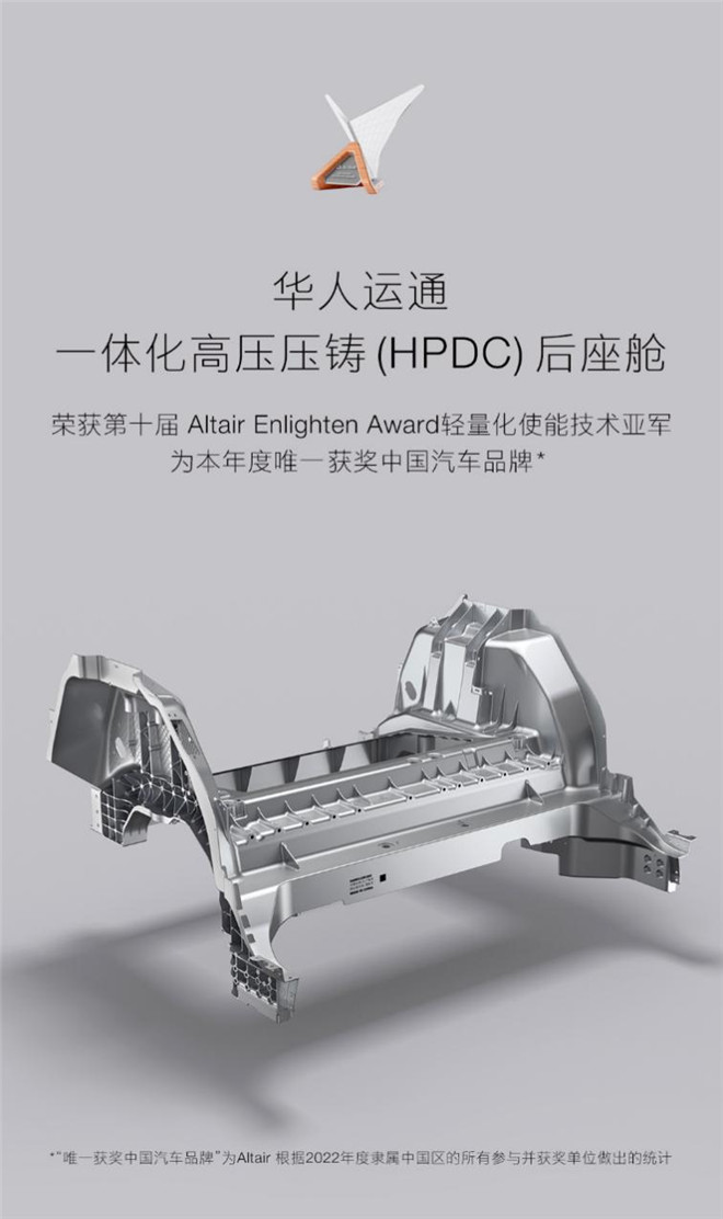 2022年8 月2 日,Altair隆重揭曉第十屆年度Altair Enlighten Award獲獎名單,華人運通一體化高壓壓鑄(High Pressure Die Casting,HPDC) 后座艙通過兼具開創(chuàng)性和可持續(xù)性的鑄造技術(shù),榮獲第十屆Altair Enlighten Award輕量化使能技術(shù)獎項,成為本年度唯一獲獎的中國汽車品牌。