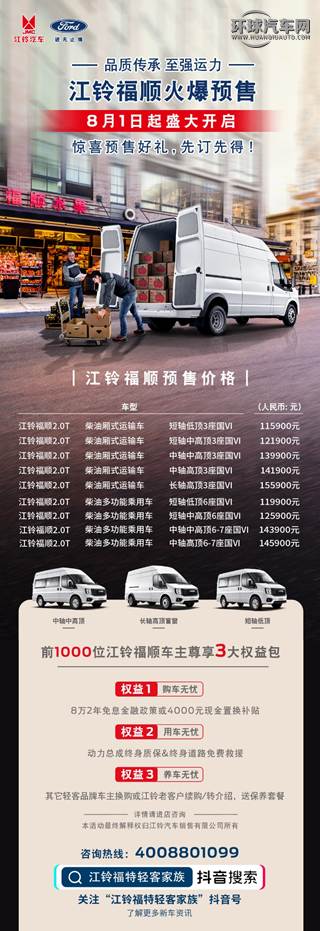 江鈴在研發福順前,做了大量用戶調研,挖掘用戶需求,研發過程中有產品共創,生產制造時融合江鈴與福特的合資資源以及前沿輕客技術,零部件和材質采用全球一級供應商,使江鈴福順成為一款合資品質、配送高效、經久耐用的輕客產品。加上11.59萬元起的預售價格,江鈴福順能夠滿足個體戶、私營企業主對于輕客車輛的極致性價比需求。