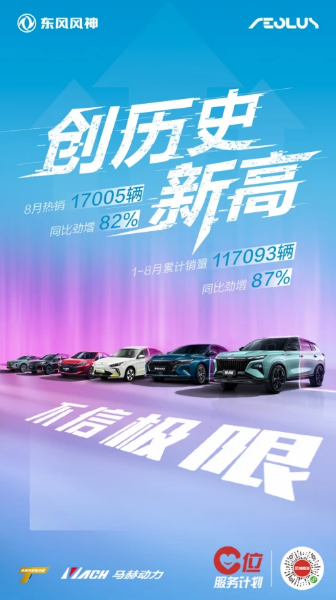 東風風神8月份勁銷17005輛,同比增長82%,創歷史最佳8月;1—8月份累計銷售117093輛,同比增長87%,緊逼去年全年12萬銷量,創同期歷史新高。