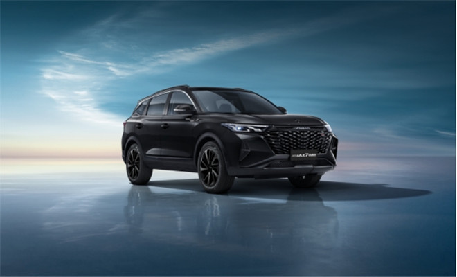 2023款AX7馬赫版整車造型氣場強大,風暴數字格柵視覺效果犀利,風舞之魂光學大燈與前格柵相連,下散熱口表面的裝飾條對稱分布,讓前臉呈現大氣兼具個性的視覺效果。新車尤其針對前格柵、前臉飾條、行李架、外后視鏡、輪轂、車側防擦條等進行了黑化處理,讓整車散發出酷炫、神秘的氣質。