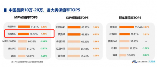 截止目前,傳祺M6已收獲超14萬車主的喜愛。擁有高銷量、好口碑之余,在保值率上,傳祺M6也大放異彩。根據汽車之家發布的《2022年度中國汽車保值率排行榜》顯示,傳祺M6以68.92%的三年保值率,位居同級別保值率榜首,而同價位的比亞迪宋max、嘉際三年保值率分別為61.27%和59.83%。