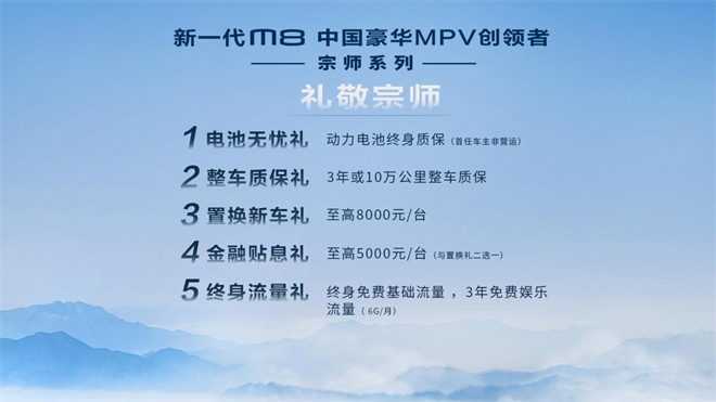 縱覽整個高端MPV市場,M8宗師以不到30萬起售價和更豪華、更先進、更舒適的體驗,極力打造出一款中國人用得起、為之驕傲的好產品。此外,為了讓消費者更輕松入手,廣汽傳祺更貼心地推出了多項購車權益,禮敬宗師: