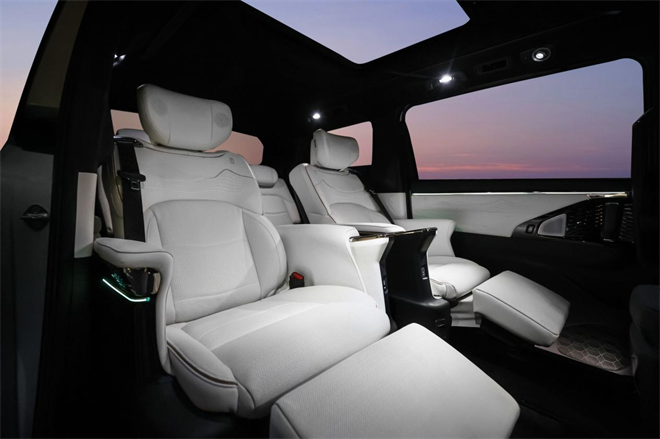 第二排為高級頭等艙,全自動半苯胺高級真皮座椅,自帶一鍵SPA模式,實現對氛圍燈、空調、香氛及座椅放倒聯動調節。創新設計的無風感健康空調,潤物細無聲地照顧到老人和小孩易感人群,成為一家老小、高端商務出行、長短途出游的宜家宜商之選。
