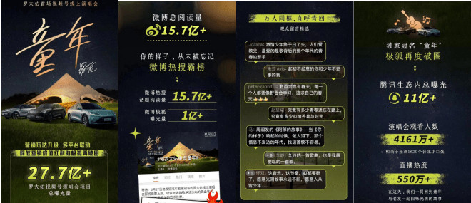 2022年受疫情影響,大量線下演唱會被取消或延期,線上演出市場迎來了前所未有的繁榮。極狐汽車以敏銳的洞察力,搶占騰訊視頻號首次商業化先機,成為第一個吃螃蟹的車企,以崔健首場線上演唱會,一舉打破沉寂,嗨爆全網。隨后,極狐汽車趁熱打鐵,聯手羅大佑引發全民情感共鳴,與黑豹樂隊、唐朝樂隊、新褲子等歌手共同打造“你要好好的”搖滾演唱會。