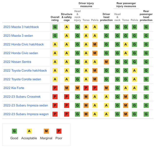 11月10日,被譽(yù)為全球最嚴(yán)苛的安全碰撞測試機(jī)構(gòu)——北美IIHS(美國公路安全保險(xiǎn)協(xié)會(huì))公布了最新的安全測試成績榜單。和以往測試對象不同的是,這次測試的11輛車型均為日系品牌和韓系品牌,包括本田(思域兩款)、豐田(卡羅拉兩款)、日產(chǎn)(國產(chǎn)車型軒逸)、起亞forte、斯巴魯(三款)、馬自達(dá)(MAZDA3兩款)。本次測試結(jié)果令人吃驚,馬自達(dá)3的兩廂和三廂車型得到G也即優(yōu)秀,堪稱一枝獨(dú)秀!其余9款車型均只得到A(可接受的)和P(差)的評價(jià),起亞和斯巴魯被選入的車型更是全軍覆沒。