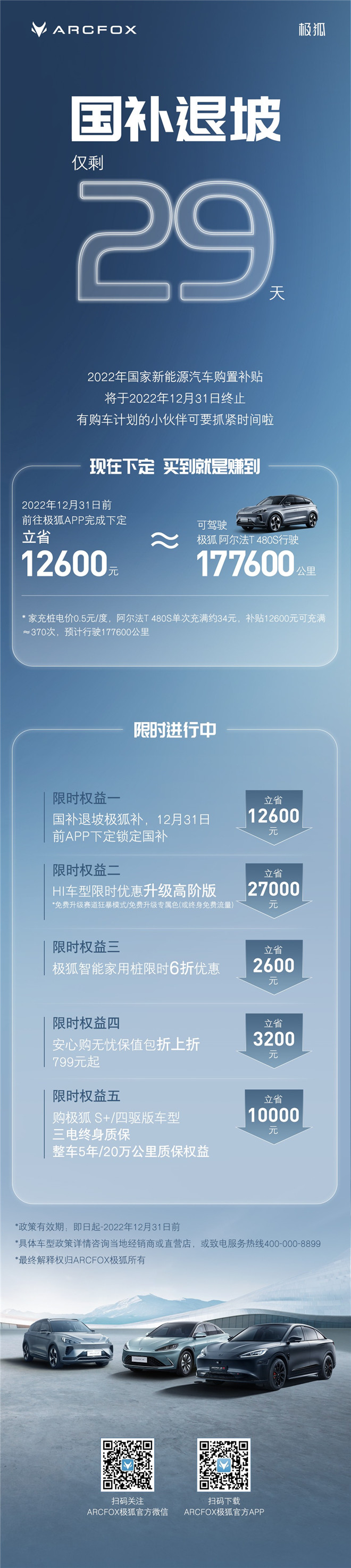 當(dāng)然來(lái)得及!極狐汽車現(xiàn)推出“國(guó)補(bǔ)退坡極狐補(bǔ)”的限時(shí)保價(jià)活動(dòng):用戶在2022年12月31日前,通過(guò)極狐APP完成下定,即可鎖定2022年國(guó)補(bǔ)后價(jià)格,相當(dāng)于每輛車直接省出12600元。同時(shí)極狐還推出了一系列優(yōu)惠政策,包括HI車型限時(shí)優(yōu)惠升級(jí)高階版、極狐智能家用樁限時(shí)6折優(yōu)惠、安心購(gòu)無(wú)憂保值包折上折(799元起)、開票鎖定三電終身及整車5年/20萬(wàn)公里質(zhì)保權(quán)益(阿爾法S和阿爾法T的S+及四驅(qū)版車型)四重限時(shí)權(quán)益,真正為用戶排憂解難,以真金白銀為用戶出行保“價(jià)”護(hù)航。