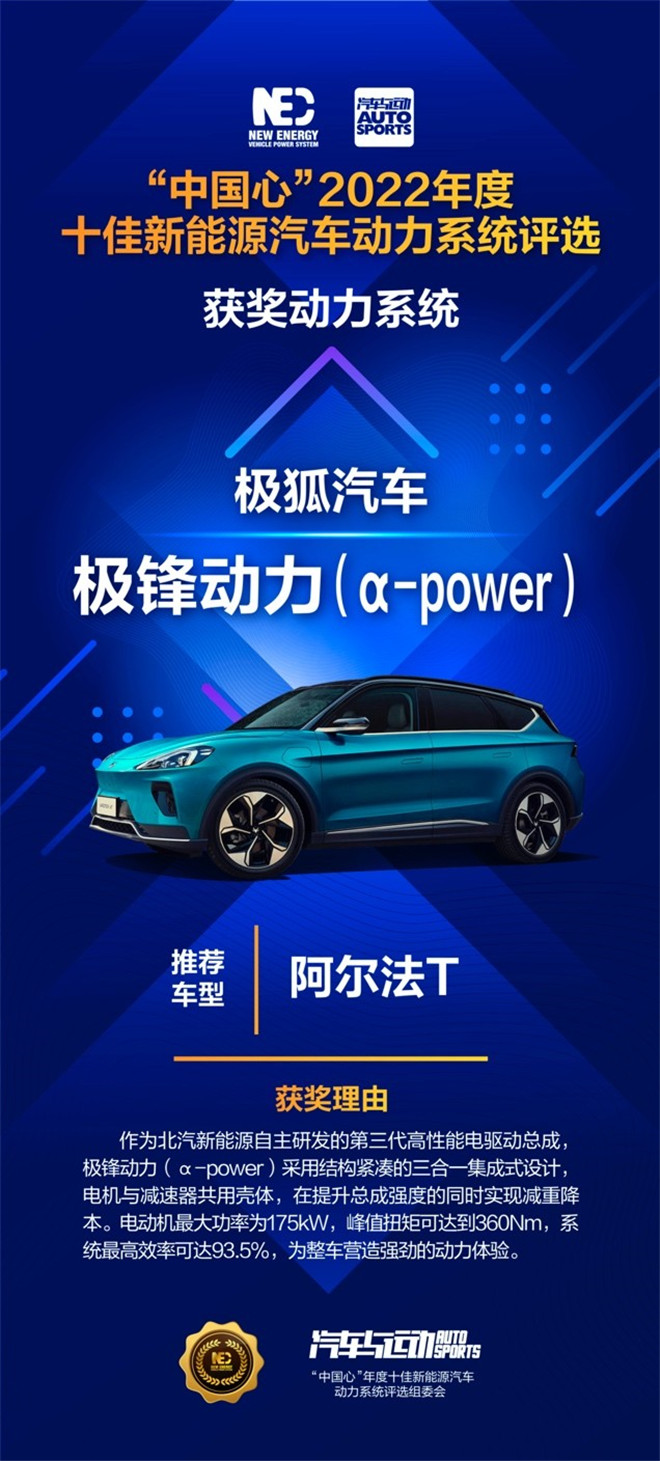 11月中旬,“中國(guó)心”2022年度十佳新能源汽車動(dòng)力系統(tǒng)評(píng)選結(jié)果正式出爐,在進(jìn)行了動(dòng)力系統(tǒng)技術(shù)評(píng)價(jià)、整車靜態(tài)測(cè)評(píng)和動(dòng)力性、制動(dòng)性能、S彎的操穩(wěn)等動(dòng)態(tài)測(cè)評(píng)后,極狐阿爾法T的極鋒動(dòng)力(α-power)榮獲“中國(guó)心”十佳新能源汽車動(dòng)力系統(tǒng)大獎(jiǎng)。