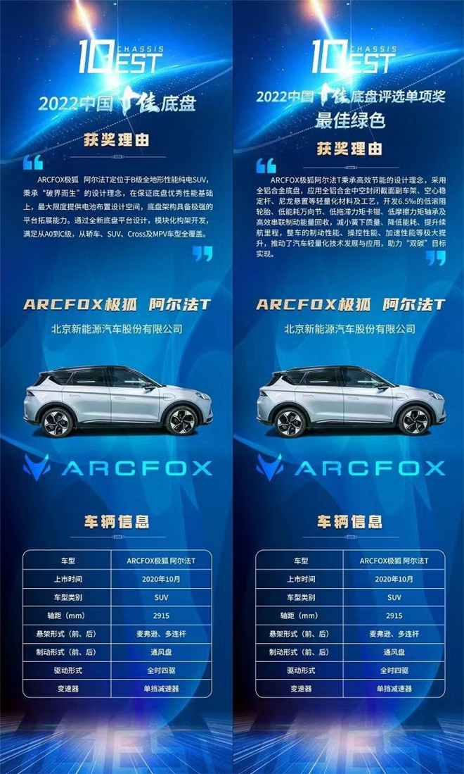 10月,經(jīng)過(guò)中國(guó)十佳底盤評(píng)選組委會(huì)全方面的嚴(yán)苛評(píng)選,極狐阿爾法T憑借優(yōu)秀的底盤性能和底盤架構(gòu)極強(qiáng)的平臺(tái)拓展能力,一舉斬獲“2022中國(guó)十佳底盤”及“最佳綠色”兩項(xiàng)大獎(jiǎng)。
