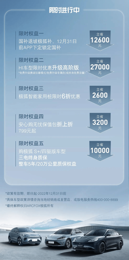 和上面幾個品牌相比,極狐汽車作為當下高端純電市場的代表,在銷售政策的制定方面更顯誠意。極狐汽車推出“國補退坡極狐補”的限時保價活動:用戶在2022年12月31日前,通過極狐APP完成下定,即可鎖定2022年國補后價格,相當于每輛車直接省出12600元;同時,極狐還推出了一系列優(yōu)惠政策,包括HI車型限時優(yōu)惠升級高階版、極狐智能家用樁限時6折優(yōu)惠、安心購無憂保值包折上折(799元起)、開票鎖定三電終身及整車5年/20萬公里質保權益(阿爾法S和阿爾法T的S+及四驅版車型)四重限時權益。