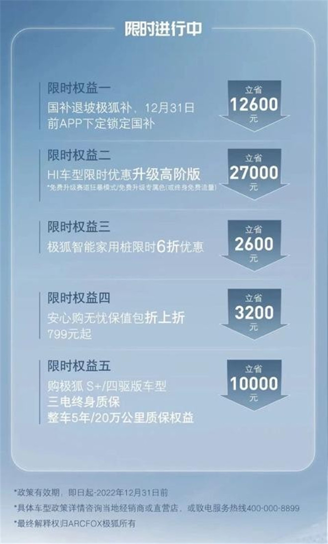 此外,極狐還推出了一系列優惠權益,包括HI車型限時優惠升級高階版、極狐智能家用樁限時6折優惠、安心購無憂保值包折上折(799元起)、三電終身質保及整車5年/20萬公里質保權益(阿爾法S和阿爾法T的S+及四驅版車型)四重限時權益,為年末購車用戶排憂解難。