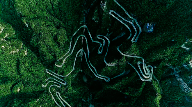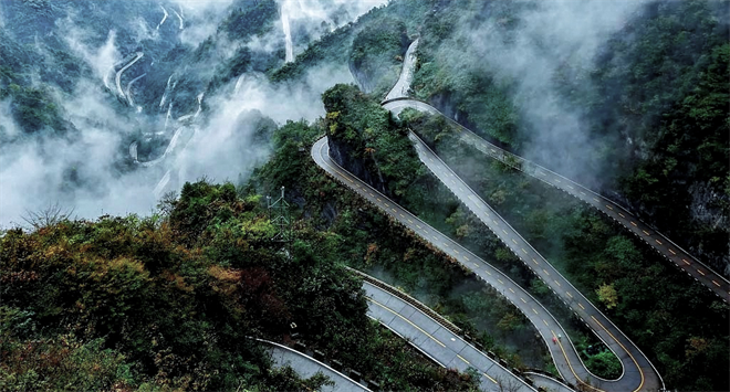 張家界天門山被譽為“亞洲第一天路”,全長10.77公里,海拔落差1100米,密布99道臨崖急彎。山路蜿蜒,加上高海拔云霧彌漫。受限的視野,夸張的坡度,側身可見的百丈懸崖。在這樣的道路上進行駕駛挑戰,一次失誤便足以造成令人難以直視的慘劇。