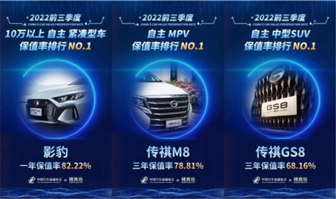在中國汽車流通協會和精真估聯合發布的《2022年度第三季度中國汽車保值率報告》中,傳祺影豹、M8、GS8分別以82.22%的一年保值率、78.81%和68.16%的三年保值率登頂各細分市場榜單。