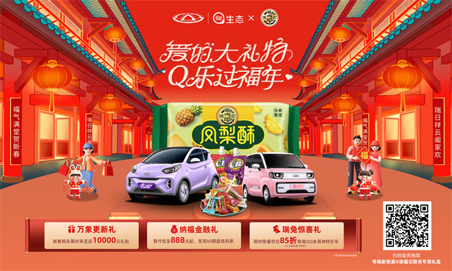 2023年1月12日,兩大國民經典品牌——全球精品智能純電小車引領者奇瑞新能源 X國民經典零食品牌徐福記正式甜蜜官宣!共創新春聯名年貨禮盒、線上H5有獎互動等,打造國民爆款“CP”,為廣大用戶送上誠意滿滿“愛的大禮物”。即日起-1月31日,網友通過掃描下圖二維碼,或關注奇瑞新能源官方微博或微信平臺參與“愛的大禮物 Q樂過福年”H5抽獎活動,就有機會獲得驚喜年貨好禮,在新的一年幸運值爆棚!