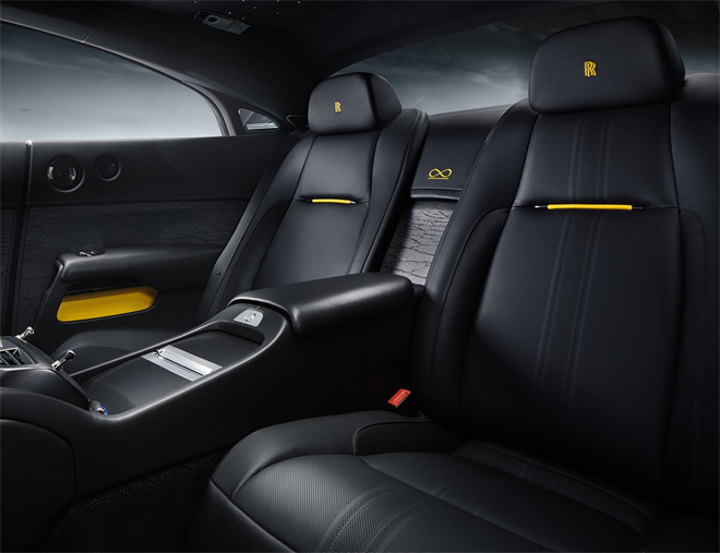 在車內,Black Badge魅影“黑箭”典藏版配備了為其特別研發的新型材質。車門扶手、座椅角撐、傳動通道、車門細節、車門裙板和下儀表板,均采用“Club”皮革包覆,其專屬的黑色皮革著色光澤度高、顏色更深,與勞斯萊斯啞光天然粒面黑色皮革一明一暗,形成巧妙對比。皮革的天然紋路得以強化,賦予該車內飾更多活力,與一位作家所描述的“喬治·埃斯頓最喜歡的俱樂部扶椅型駕駛座椅”更為相似。為與Black Badge系列大膽前衛的色彩保持一致,該車座椅采用亮黃色皮革。座椅上方、外側頭枕飾有箭頭刺繡圖案,觸感豐富。該圖案也意在致敬Thunderbolt賽車鋁制車身上的箭頭符號。當時,為了使電子計時器能夠更準確識別捕捉到賽車的行駛極速,Thunderbolt賽車的車身上涂飾了黑色箭頭。