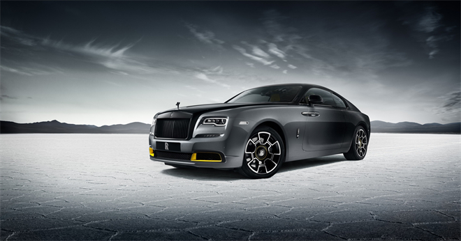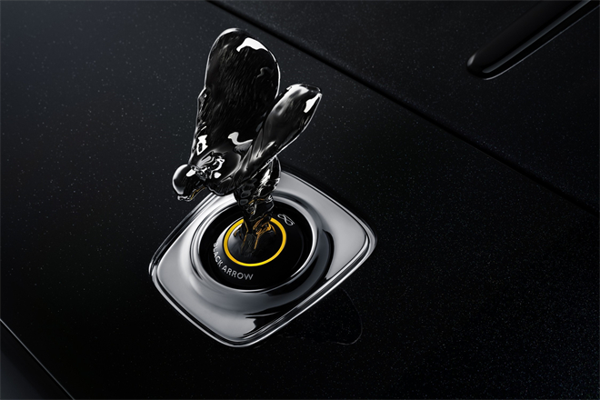 亮黃色的保險杠嵌件、勞斯萊斯Bespoke高級定制輪轂細條紋與漸變車漆形成鮮明對比,讓人想起Thunderbolt賽車黑色箭頭內的黃色圓圈。魅影“黑箭”典藏版位于散熱器格柵之后、發動機之前的V型撐桿,首次以亮黃色飾面,巧妙地將視線引至Black Badge 深色鍍鉻格柵后方的V12發動機。亮黃色一直延伸至分層碳纖維材料制成的“歡慶女神”雕像底部。該車的“歡慶女神” 雕像底部飾有亮黃色圓環,并刻有魅影“黑箭”典藏版的車名。