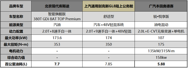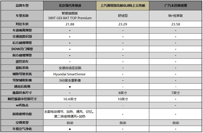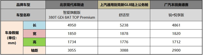 預(yù)算20萬(wàn)+買(mǎi)一臺(tái)乘坐舒適、空間寬敞的家用MPV,北京現(xiàn)代庫(kù)斯途、別克新GL8、本田奧德賽三款市場(chǎng)最熱門(mén)的MPV該如何選?為此,我們選擇北京現(xiàn)代庫(kù)斯途是售價(jià)21.88萬(wàn)元的智愛(ài)旗艦版380T GDi 8AT TOP Premium(以下簡(jiǎn)稱:現(xiàn)代庫(kù)斯途),上汽通用別克新GL8選擇售價(jià)23.29萬(wàn)元的舒適型(以下簡(jiǎn)稱:別克GL8),廣汽本田奧德賽是售價(jià)23.58萬(wàn)元的銳·悅享版(以下簡(jiǎn)稱:本田奧德賽),進(jìn)行產(chǎn)品力的橫向?qū)Ρ纫环指呦拢?/p>