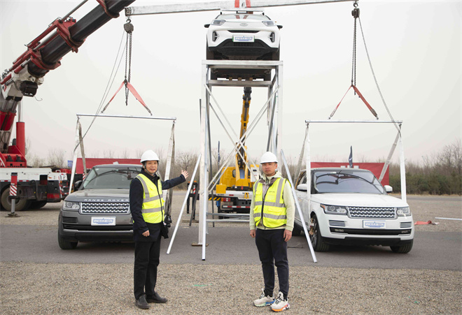 此次挑戰的是2臺重量均為2.5噸的路虎攬勝行政版,將奇瑞小螞蟻放置杠桿中間,使之形成“天平”效果,兩側力臂長度各3米,再加上兩側新增加的拉桿和導輪等附件,杠桿整體重量為0.25噸。兩側重量一致,不受“角速度”等變量影響,所以這次作為支點的奇瑞小螞蟻承重的重力則5噸(2臺路虎攬勝行政版)+0.25(杠桿重量),即需要面對5.25噸的壓頂挑戰。在這種雙重重壓下,奇瑞小螞蟻卻依舊穩穩撐起了2臺路虎攬勝行政版,其全鋁車身也堅固如初。