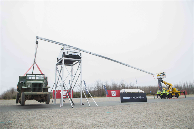 因此,奇瑞小螞蟻需要承受的重力為5噸(軍用重卡)+0.8噸(杠桿重量)+0.5噸(向下拉力)總和,即為6.3噸,在考慮“角速度”等變量后,奇瑞小螞蟻作為支點需要承受的重力在7-8噸,接近第一輪挑戰的2倍重,是奇瑞小螞蟻的7倍自重。但在巨大考驗下,GMC CCKW 353軍用卡車四輪依次離地,奇瑞小螞蟻挑戰成功,并且,其全鋁車身結構依然保持完整,安然無恙,這充分證明了其強悍車身結構高強度的安全實力。