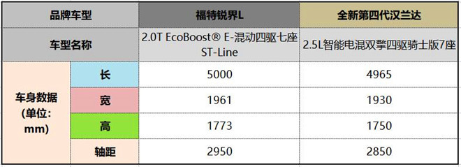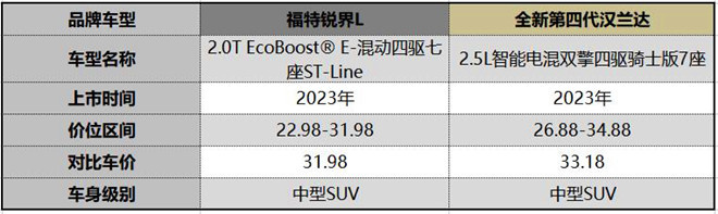為此,我們遵循價格相近原則,選擇售價為31.98萬元的長安福特銳界L 2.0T EcoBoost E-混動四驅七座ST-Line(以下簡稱:銳界L),以及售價33.18萬元的豐田全新第四代漢蘭達2.5L智能電混雙擎四驅騎士版7座(以下簡稱:漢蘭達),看看到底誰更優秀!