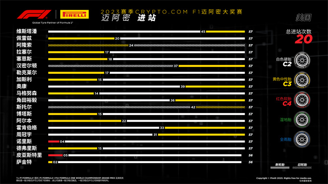 威廉姆斯車手洛根·薩金特,使用硬胎完成了最多圈數。他在第二圈就換上了硬胎,一直使用這套輪胎跑完比賽:總計使用這套胎完成54圈。阿爾法·羅密歐車隊的周冠宇,中性胎圈數最多,完成了26圈,而邁凱倫車隊的奧斯卡·皮亞斯特里則是軟胎圈數最多的車手,在起步后使用軟胎完成5圈。