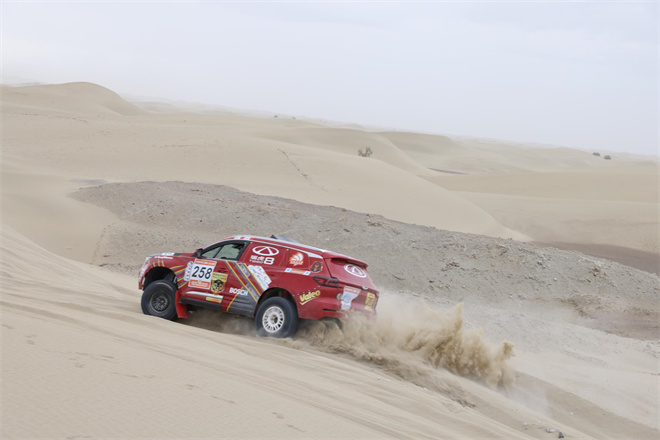 隨著SS3麥蓋提賽段的到來,本屆環塔拉力賽最艱巨的挑戰隨即降臨,172公里的全沙漠路段成為了決定比賽勝負的“分水嶺”,更是檢驗賽車絕對實力的“試金石”。在這場沿北緯39度橫跨“死亡之海”塔克拉瑪干沙漠的極限穿越中,賽車的耐久性與動力性能得到了前所未有的大比拼。奇瑞瑞虎8車隊在這個賽段火力全開,在絕塵的速度與絕佳的操控加持下,人車合力上演了一場精彩絕倫的“沙漠之舞”。瑞虎8冠軍家族賽車飛馳騰挪在沙海間,一個個陡峭的沙丘被不斷甩在身后,強悍的鯤鵬動力無疑為賽車注入了極大的速度優勢。在兩天異常艱苦的N39賽段以及隨后進行的SS5塔克拉瑪干賽段、SS6沙海老兵賽段中,奇瑞瑞虎8車隊發揮穩健,繼續保持T2.1組領先位置,六大驚險賽段均成功完賽,展現出強者無懼的冠軍實力與王者風范。