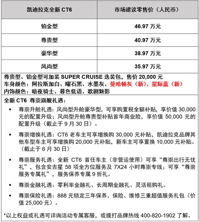 (2023年5月28日)上汽通用汽車凱迪拉克品牌宣布,凱迪拉克全新CT6正式上市,共推出風尚型、豪華型、尊貴型、鉑金型四款車型,售價35.97萬元-46.97萬元,提供5種車身顏色和3種內飾顏色選擇。同時,全新CT6重磅推出五大尊崇旗艦禮遇,可享至高價值6萬元升艙禮和至高3萬元CT6老車主增換禮,以滿級的誠意與先鋒用戶攜手并進。即日起,新車已全面到店。作為凱迪拉克“油電同享”品牌煥新策略的旗艦車型,全新CT6實力彰顯煥新的高度。憑借先鋒設計、智能豪華、頂級駕控三大核心賣點,以硬核實力樹立豪華車市場“新汽車”標桿。