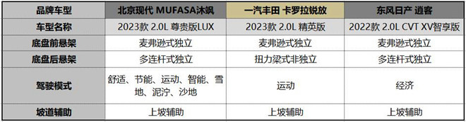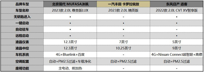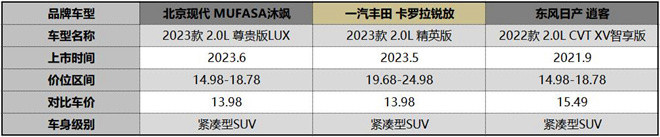 為此,我們遵訓價格相近原則,選擇售價13.98萬元的北京現代MUFASA沐颯2023款2.0L尊貴版LUX(以下簡稱:沐颯),售價13.98萬元的一汽豐田卡羅拉銳放2023款2.0L精英版(以下簡稱:卡羅拉銳放),以及售價15.49萬元的東風日產逍客2022款2.0L CVT XV智享版(以下簡稱:逍客),看看北京現代MUFASA沐颯到底表現如何!