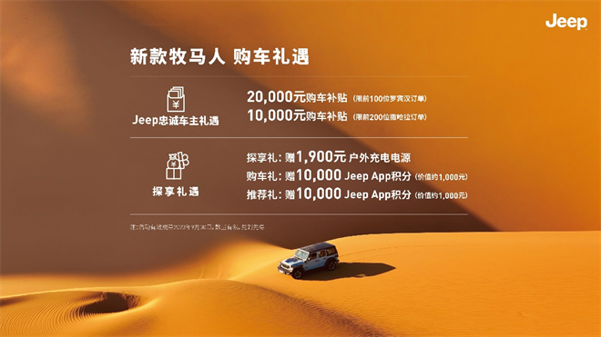 更值得一提的是,2024新款Jeep牧馬人為感謝 Jeep車主的升級(jí)置換或增購,奉上忠誠車主專屬禮遇:即日起至9月30日,前100名購買新款牧馬人羅賓漢的忠誠車主,可獲20,000元購車補(bǔ)貼;前200名購買新款牧馬人撒哈拉的忠誠車主,可獲10,000元購車補(bǔ)貼。
